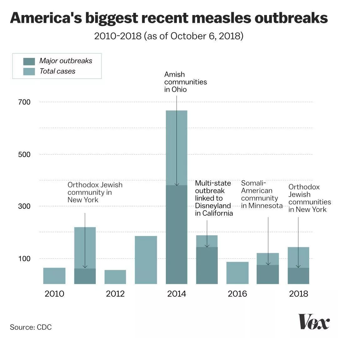 因为美国多个州允许因宗教原因不接种疫苗,最近这些年的麻疹爆发大多和未接种疫苗儿童较集中的宗教社群有关。比如根据CDC的说明,2014年的麻疹大爆发,主要是发生在拒绝现代科技的俄亥俄州阿米什人社群中;而2011和去年的纽约地区爆发,也是发生未接种疫苗儿童较多的犹太正教社区。