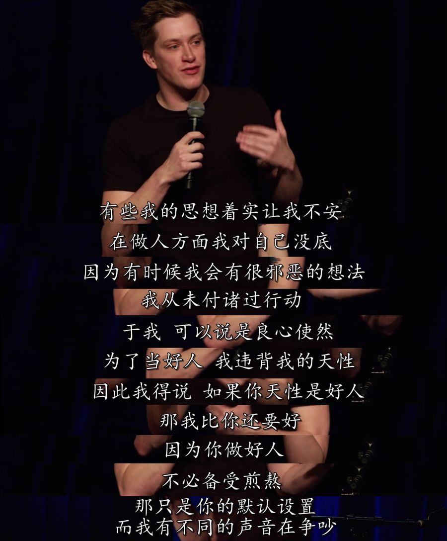 我们很喜欢的苏格兰单口喜剧演员 Daniel Sloss 曾经这样分析过自己脑海中的各种恶念:因为良知的存在,人才会违背了自己脑海中各种自然产生的作恶想法。