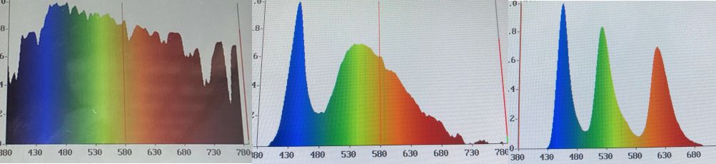 蓝光是太阳光中自然的存在,所以我们的人生不可能真的“隔绝蓝光”,否则我们就看不到白色了。我们之前测试阳光(左)同LED灯(中)以及手机屏幕(右)的光谱,很明显可以看到相比LED和手机屏幕,阳光中波长小于430nm的高能蓝紫色光比例更高。