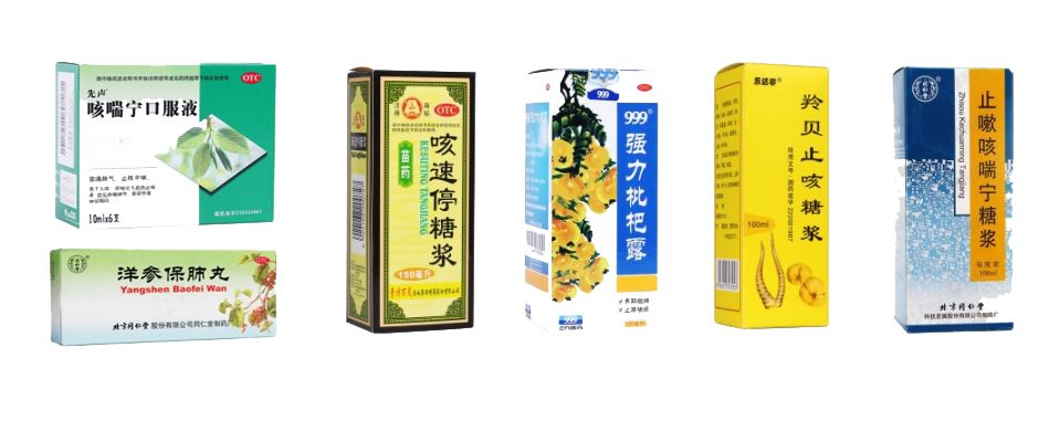 其中包括不同种类的药物,如口服液、糖浆、冲剂、片剂、胶囊,我们列其中一小部分:咳喘宁口服液、咳露口服液、哮喘胶囊、二母安嗽糖浆、咳速停糖浆、复方满山红糖浆、克咳片、止嗽咳喘宁糖浆、咳痰合剂、羚贝止咳糖浆、长城止咳喘糖浆、消炎止咳胶囊、麻芩止咳糖浆、黄英咳喘糖浆、兰花咳宁片、咳喘宁口服液、可咳胶囊、枇杷止咳冲剂......