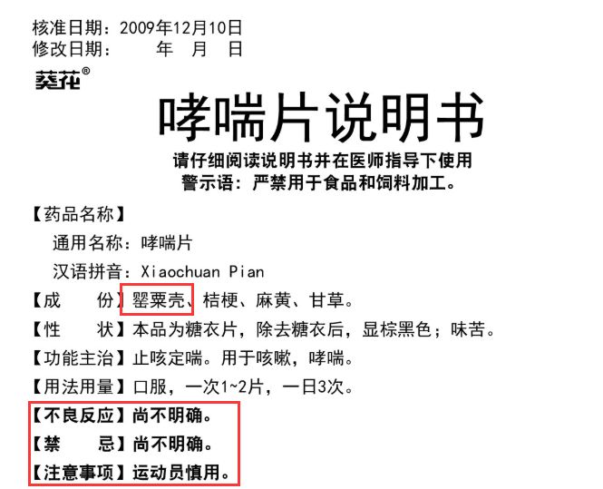 比如葵花药业的哮喘片,这款药物的处方是:“罂粟壳 443g、桔梗 110g、麻黄 443g、甘草 66g”,也就是说这个药片中有将近一半都就是罂粟壳。