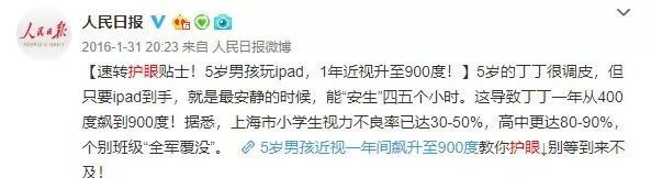 仅仅在人民日报的微博上搜一下,就发现类似小朋友看Pad看手机,瞬间高度近视的新闻多次出现,基本都是从都市报里转载来的。