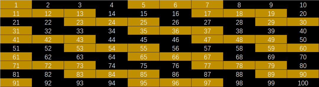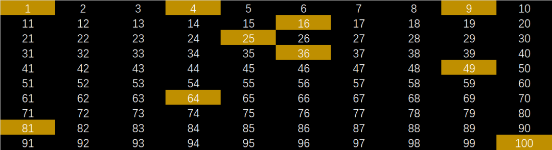 灯最初都是关上的,之后如果被开关偶数次,就还是关上。如果是开关奇数次,就是打开的状态。所以这个问题其实是在问:1-100中,有哪些数字有单数个因数。