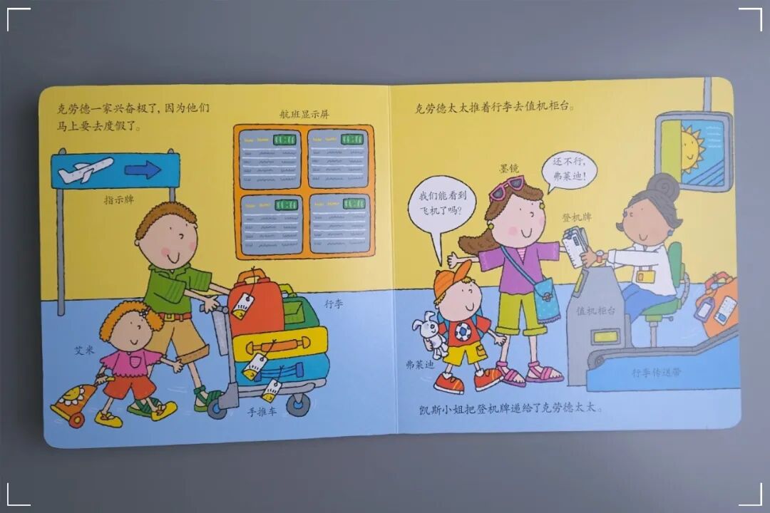 当我们要去较远的地方旅行时,飞机就是一个经常会选择的交通工具了。本书把一系列的登机流程都标示的特别清楚、直观。故事中的克劳德一家要去度假了,他们在机场和飞机上都经历了哪些事情,一起来看看吧。