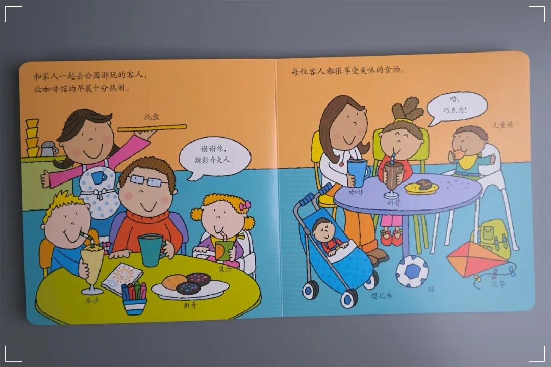 这天早上,天还没有亮,斯彭奇夫人的咖啡馆就已经准备营业了。她的咖啡馆不止提供咖啡,还提供很多种简餐和甜点。小朋友在父母的陪伴下,来了解书中都有哪些厨房用具和常见美食。