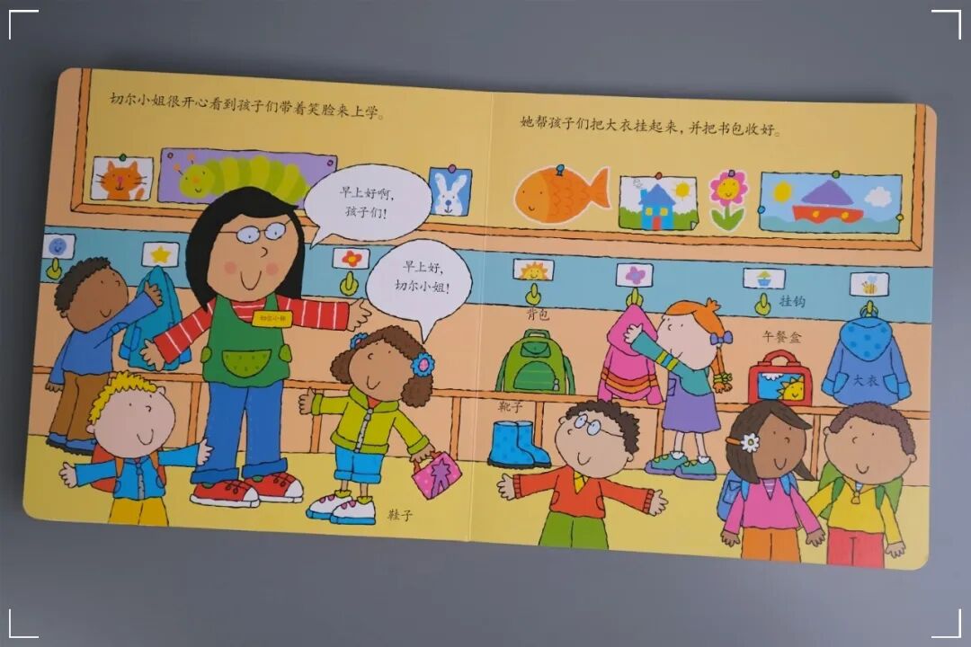 每本书的内容都是某一个场景的简单的日常小故事,让孩子自然而然的进入一个场景,了解在这个场景中有什么人物、会有什么布置,可能会发生什么有趣的事情。这部分可以当做场景认知书来用,家长给宝宝读书讲故事,然后可以引导宝宝进行回忆:场景里都有什么人物,他们都在做什么,有什么物体、食物,长什么样,什么颜色?一次次的交流与沟通,不仅可以让小朋友加深认知印象,也可以拉近父母与宝宝间的距离,而且也提升了宝宝语言表达的能力。