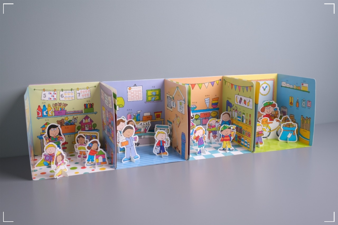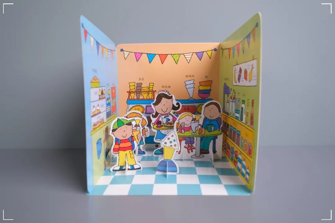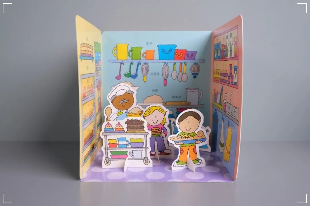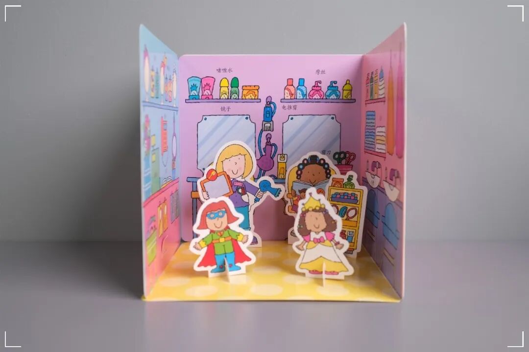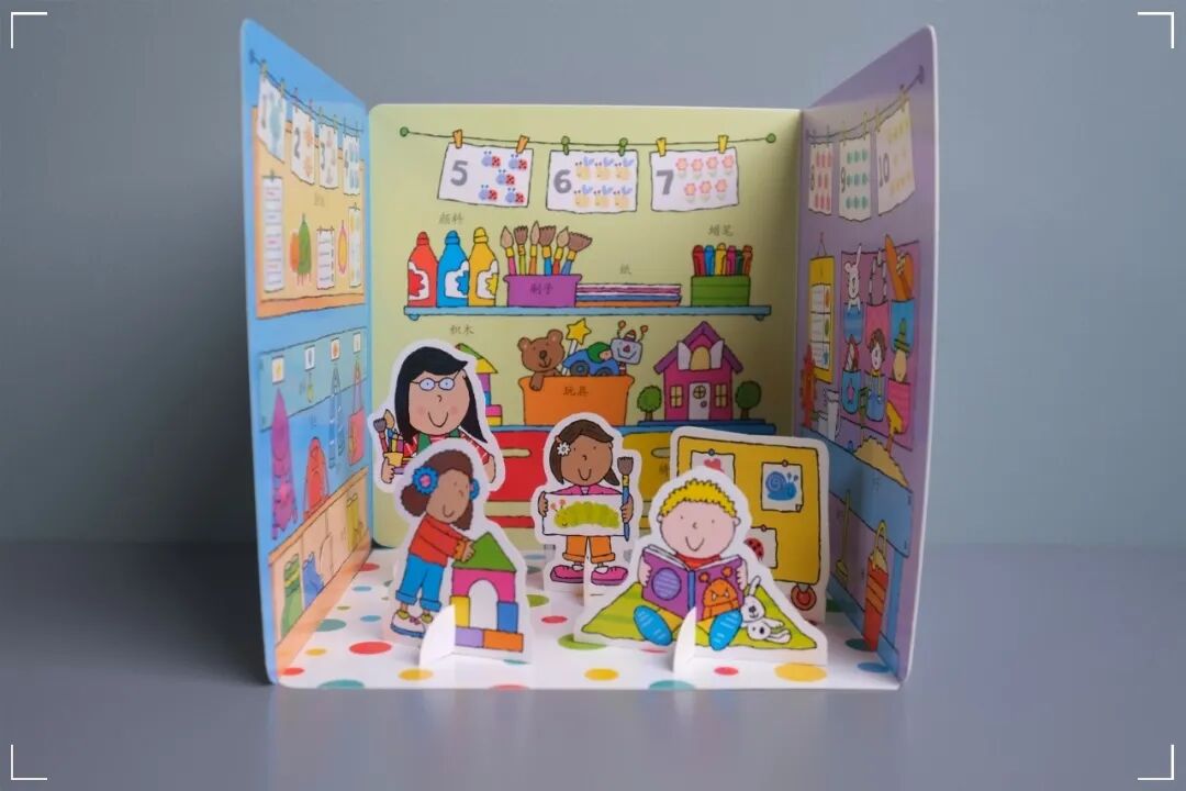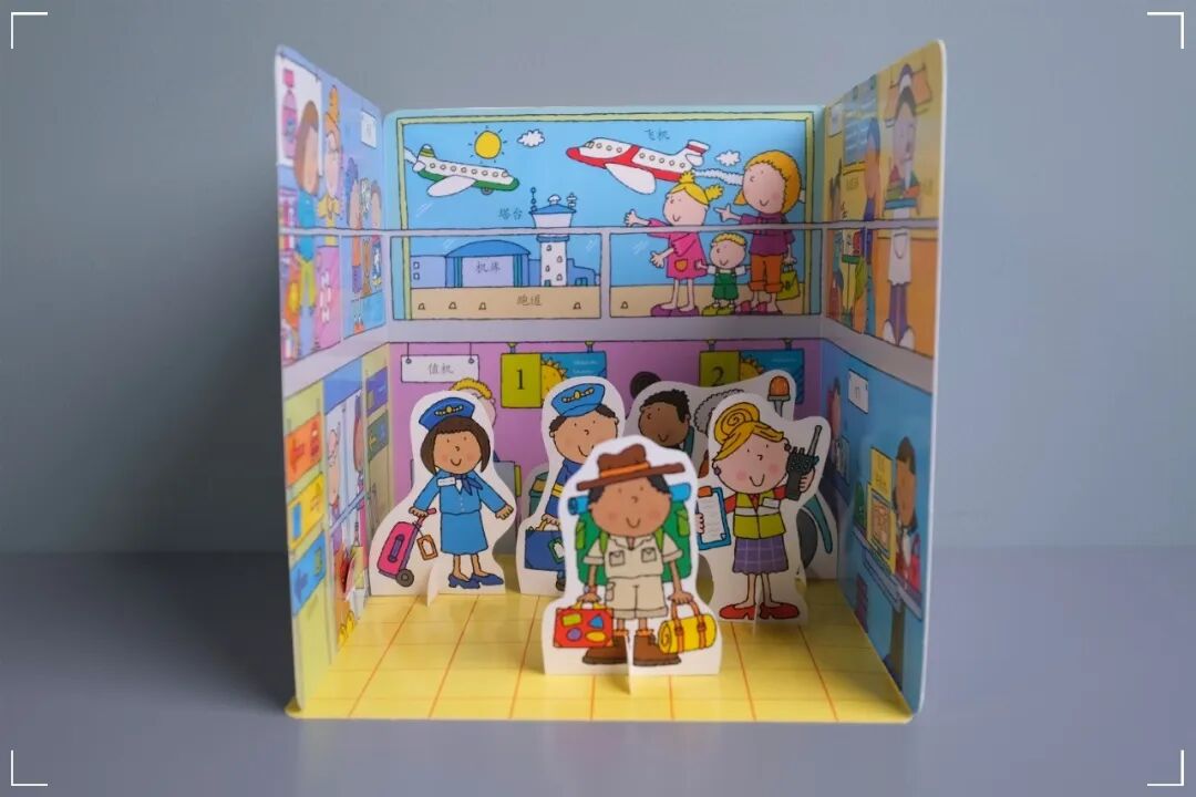 每本书都可以看做两个部分:关于一个场景的纸板故事书,以及一个对应场景的搭建模拟玩具。