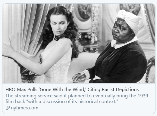 首先是HBO从自己的HBO Max上下架了《乱世佳人》,原因是这部电影的视角是站在内战南方视角,美化了当时的奴隶制。据HBO说,下架是暂时的,之后会重新上架,到时会增加一些对电影背景解读和分析之类的内容。