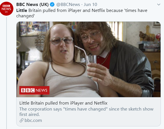 而类似的事情不仅仅发生在美国,昨天英国BBC宣布从线上下架Little Britain,这部2003年到2006年英国神剧的两位主创刚在BBC4月新冠慈善活动中重聚,现在又一次成为热点。在小不列颠系列的短剧中,两人曾化妆成各种不同肤色的人种,因此被BBC认为“目前不合时宜 Times have changed”,因此被下架。
