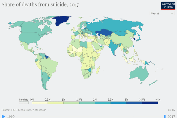 看一下1990-2017年全球各国&地方自杀率变化情况(变深就是严重,变浅就是好转):