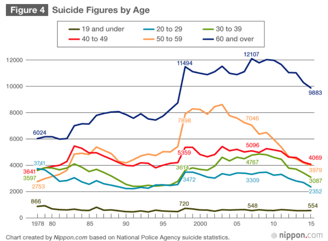 自杀,这种极端行为背后的原因很复杂。影响自杀率高低的社会因素很多,宗教、气候、政治动荡、经济形势、文化传统,都是导致自杀率高的因素。比如上世纪末,日本经济崩溃后,日本自杀率激增一倍。而同期中国经济快速增长,社会尤其是农村逐渐稳定,中国自杀率从90年代全球能排进前十的20/10万人口,直接下降到8/10万人口,下降幅度超过60%,名列WHO同期自杀下降榜的全球第一。