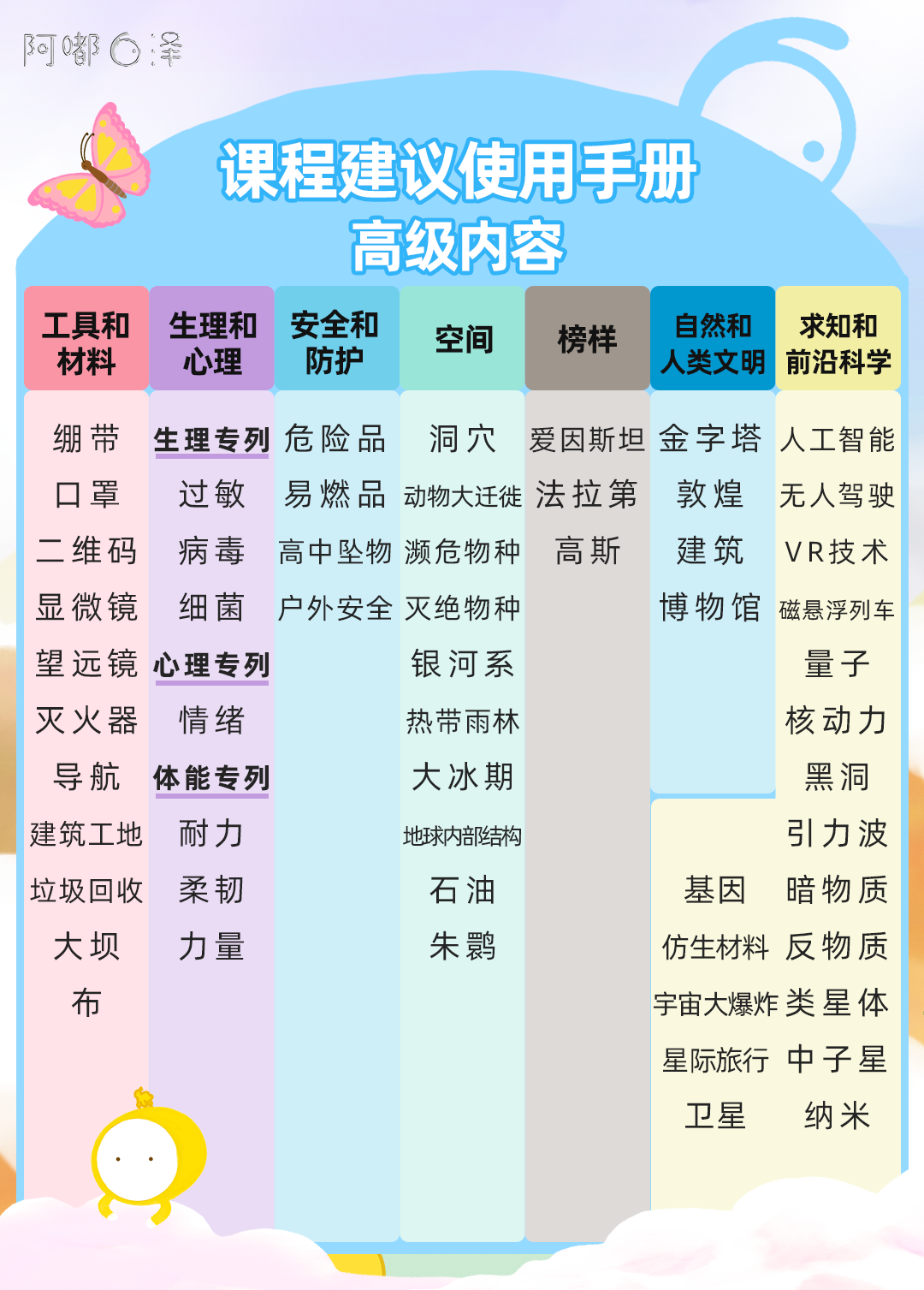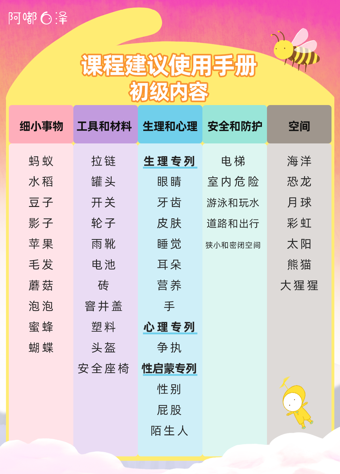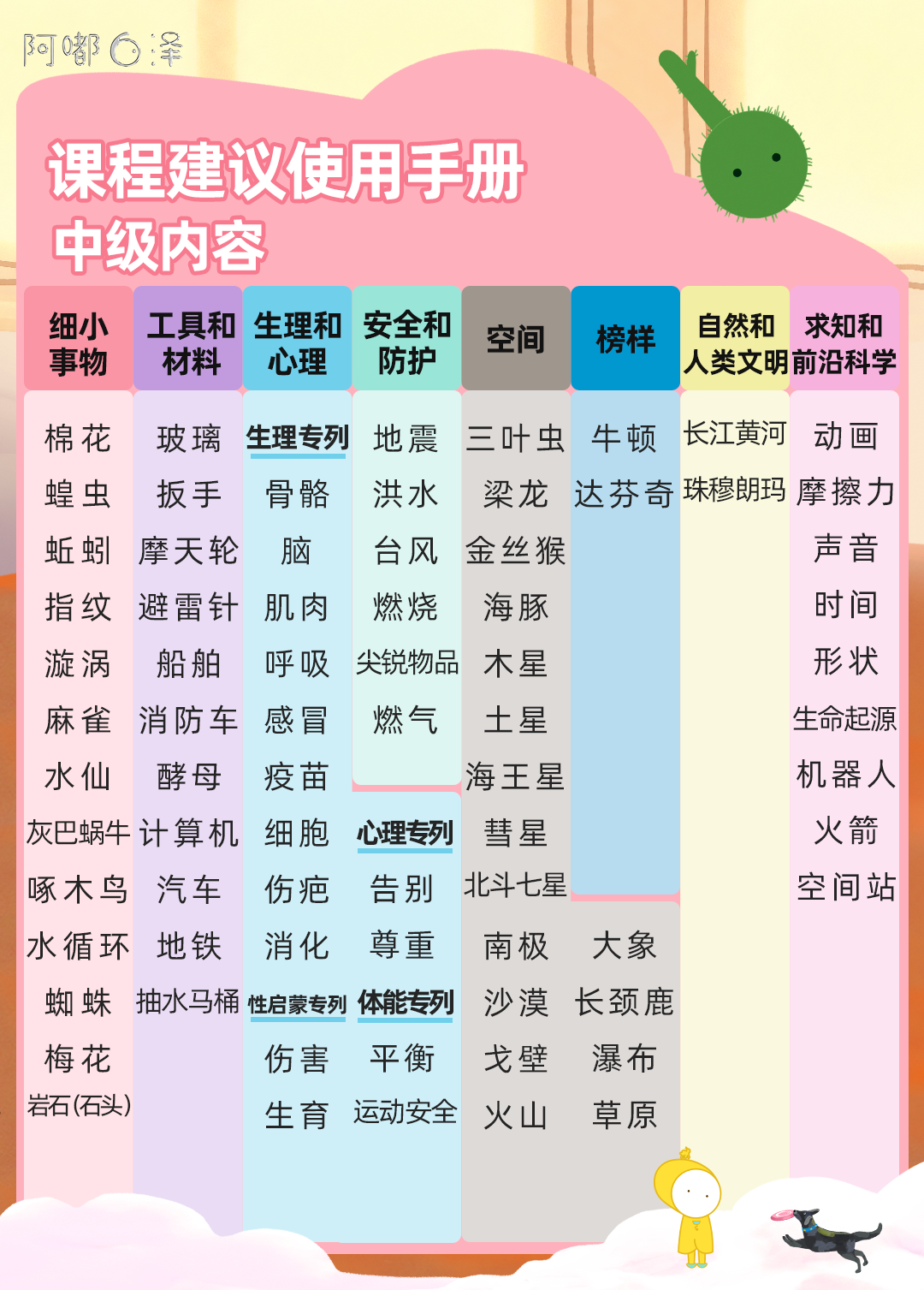 所以我们和白泽团队一起,参考中国教育部给学前孩子制定的《3-6岁儿童学习与发展指南》,对照其中低中高3个年龄段的幼儿科学学习与发展的具体目标对课程重新进行了排序分类。