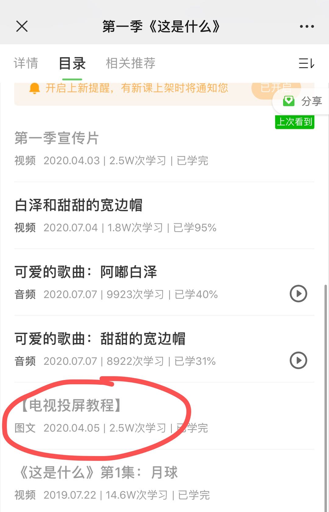 在更新阶段,我们觉得这种安排是合理的。不过当更新完成后,小朋友再打开动画课程,就是一次接触100节的内容。已经熟悉白泽,看过几遍的小朋友可以随意选择自己喜欢的内容来看。但对于第一次接触白泽的孩子来说,就需要更有推荐性的方式,或者说顺序来观看这100个不同主题的内容了。