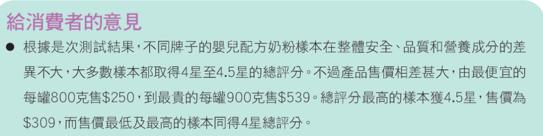 常见消费误区1:测试发现,十几种婴儿配方奶的安全、品质、营养成分差异不大,得分也几乎差不多,但价格相差很大。因此消费者委员会提醒,没必要特别追求贵的配方奶,并不是贵的就比便宜的好很多。(当然是在品牌都有保障的前提下)