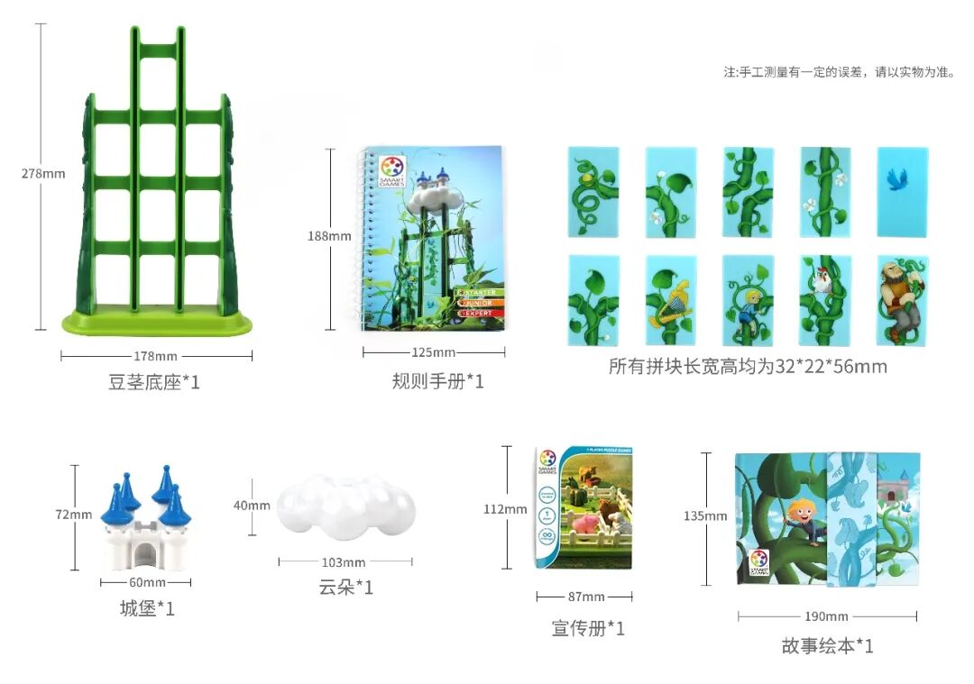 玩具内含:故事绘本1本、闯关关卡&规则手册1本、中文说明书1张、城堡1个、云朵1个、宣传册1份、豆茎底座1个、双面豆茎拼块10个。