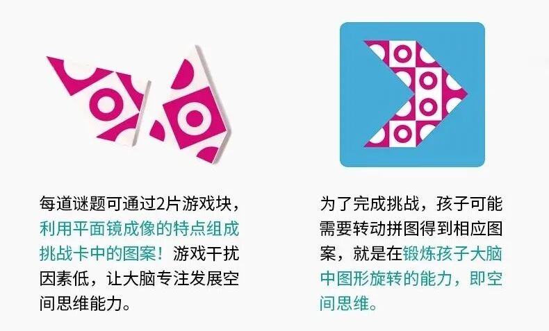 透视镜面的玩法源于平面镜的成像原理,通过一面平面镜镜像图形卡片上的图形来完成关卡的任务,锻炼小朋友的空间想象能力。