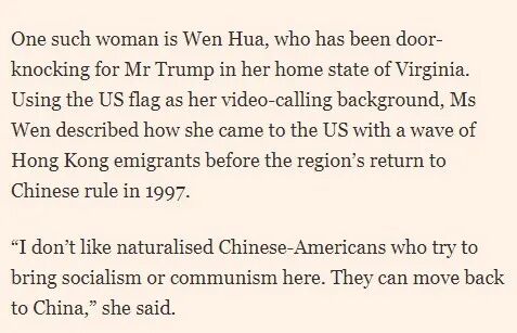 其中一个叫做华雯(音译),她曾在弗吉尼亚为川普四处敲门拉票。和她视频时,她用美国国旗作为背景,她描述了自己如何在97年香港回归中国之前搬到了美国。