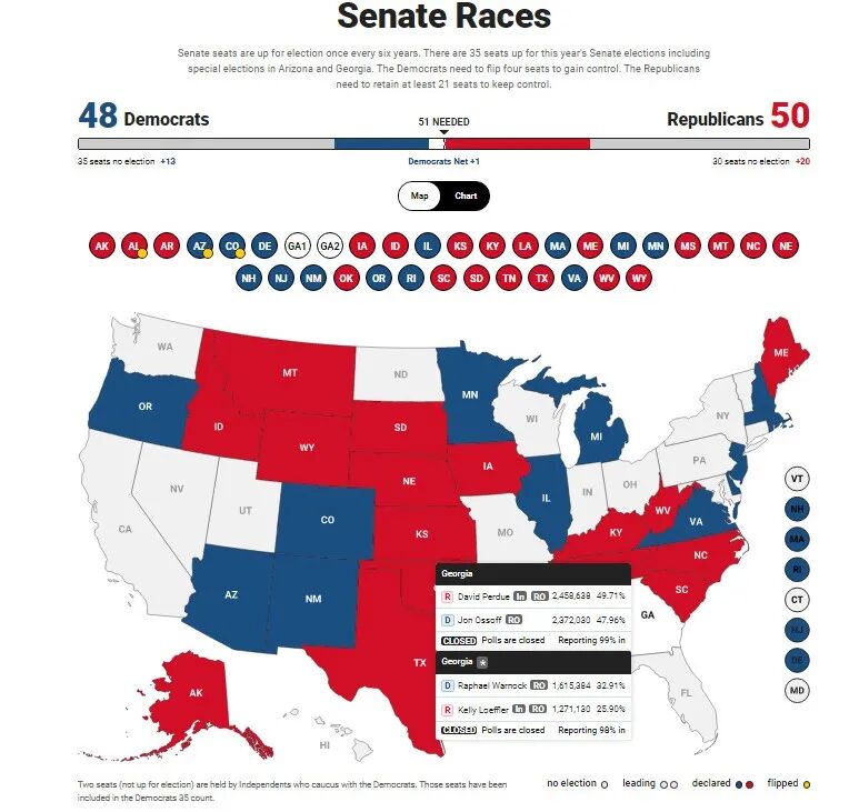 参议院选举最后的悬念,是乔治亚州的两个席位,因为没有候选人超过50%,要等到明年1月重选 —— 民主党只有把这两个原本是共和党的席位都抢到,并且在参议院投票的时候内部一致(民主党中有些中间派参议员,比如西佛吉尼亚的Joe Manchin,差不多一半时间是跟着共和党投的),才有可能变成50:50的平手。根据美国参议院的投票规则,如果50:50,就可以请副总统来投票打破僵局。这是民主党目前对未来最大的盼望。