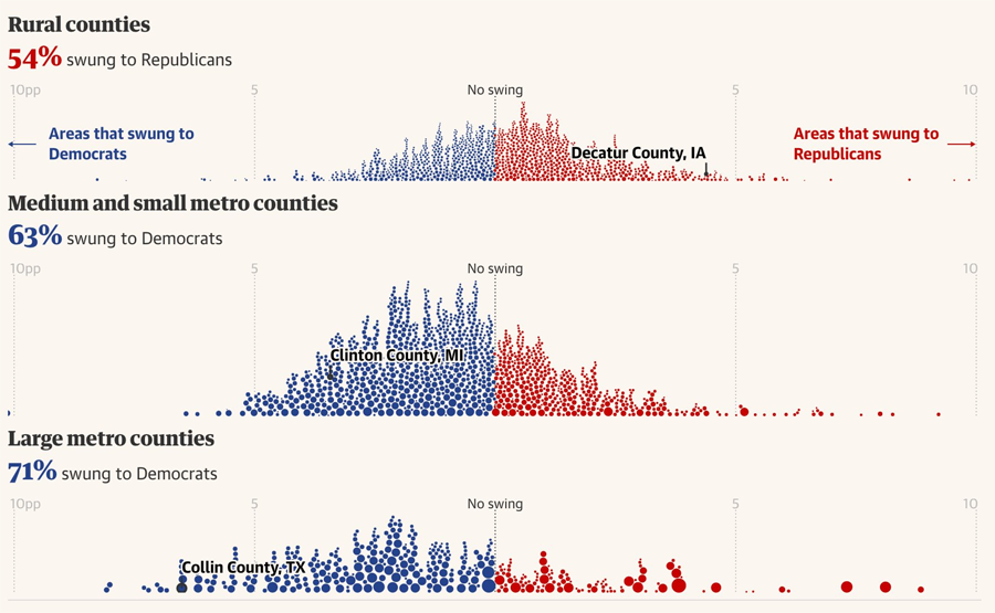↑从上到下:农村、中小城市、大都市区域的政治倾向地图
