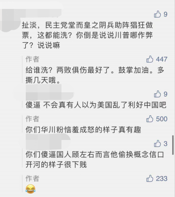 有一个重要的事情一定要多强调几次,那就是华川粉是美国人,不是中国人。虽然中国人中也有一些看戏看到太入戏的川普支持者,但和那些主动自发替川普四处拉票,甚至跑到微信上给川普做免费宣传的美国华人中的川普死忠粉远远不一样,别对号入座。