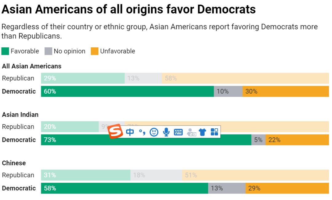 ↑从上到下:亚裔整体、印度裔、华裔的两党支持(绿条)、中立(灰)和反对(黄)比例