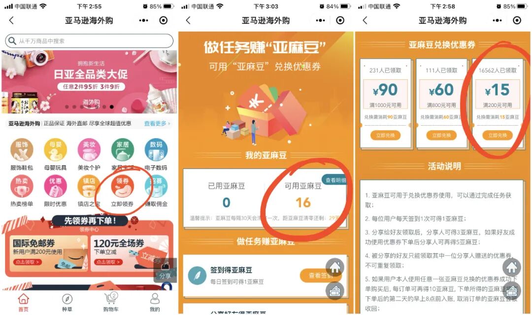 每个用户都会默认有15个亚麻豆,可以在页面下方领取一张满200-15的优惠券。做活动还可以领取更多的亚麻豆,但需注意亚麻豆的有效期。