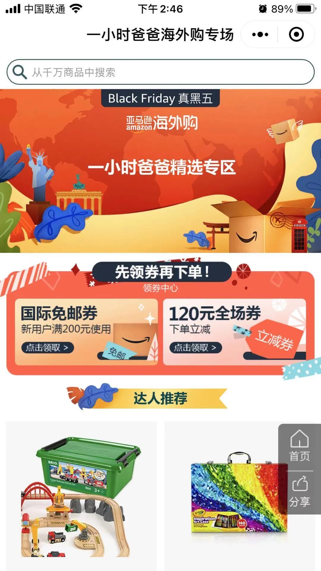 订单满200可以领取国际免邮券:进入一小时爸爸专区小程序页面会自动弹出/领取: