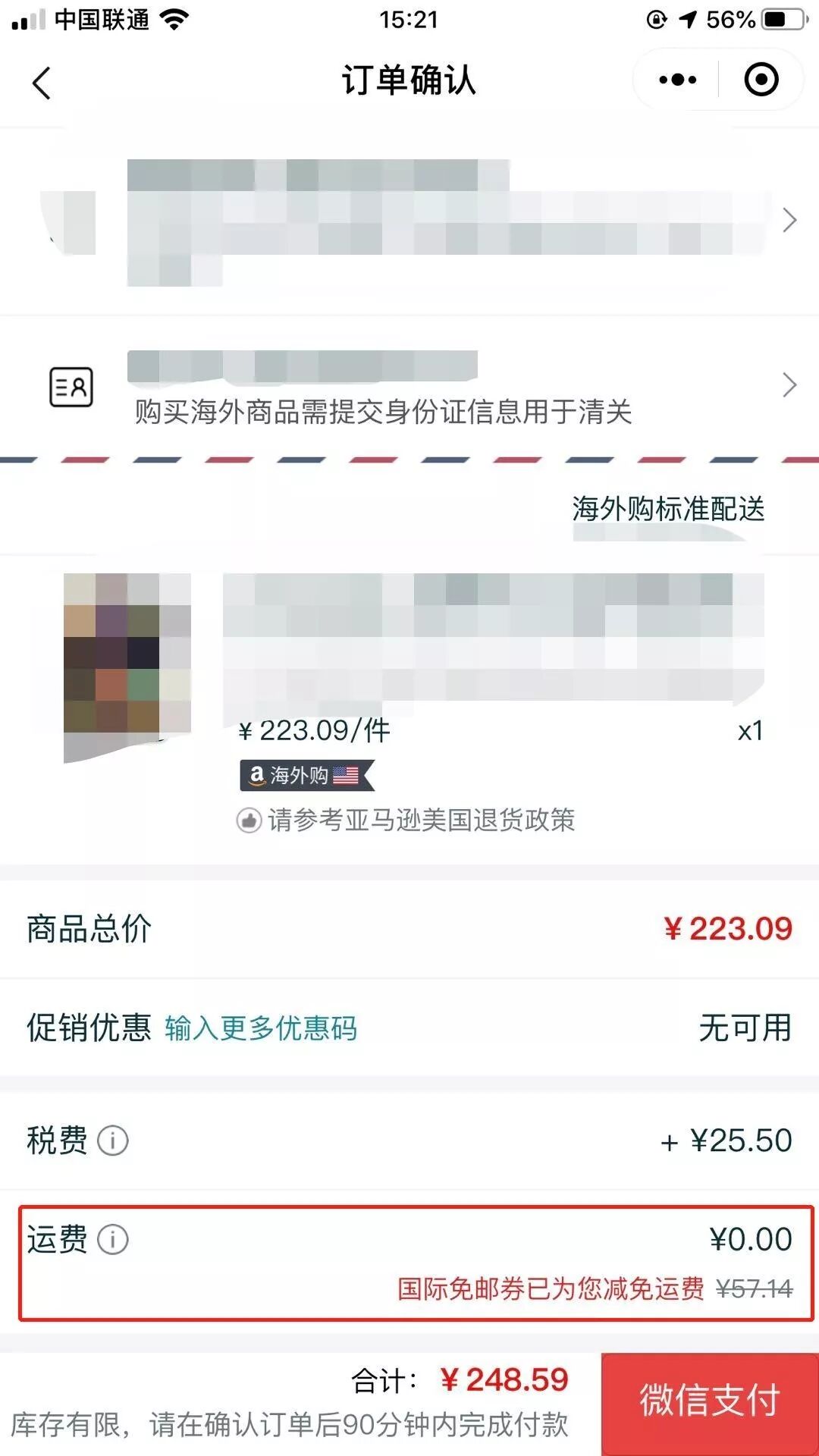 根据海关要求,下单时请确保绑定的身份证号码及姓名需要和微信支付人(即微信支付绑定的身份证)信息一致。如在购买亚马逊海外购商品后接到要求海关清关短信/电话,请及时根据要求进行清关。如有任何疑问,可拨打亚马逊客服电话400-910-5680请求协助。