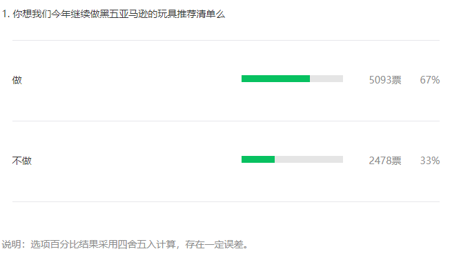 但临近今年的黑五我们开始纠结起来,因为疫情的关系,不了解大家是否还要我们做黑五亚马逊的推荐活动。所以周二的时候我们做了一个投票,让大家来选是否还要今年的推荐。最后让我们做推荐和不做的读者是67%:33%。
