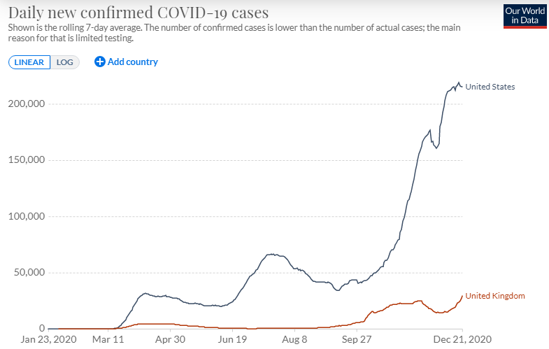 英国和美国新增确诊7日平均曲线