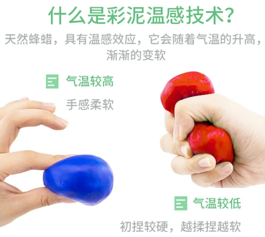 不同于市面上其他的其他彩泥,weible温感彩泥具有不沾手、易保存不会干、可以反复多次使用、随意混色、软硬度随着温度变化、颜色丰富、塑形能力好、可食用级材质、安全可靠的多种优秀特性。