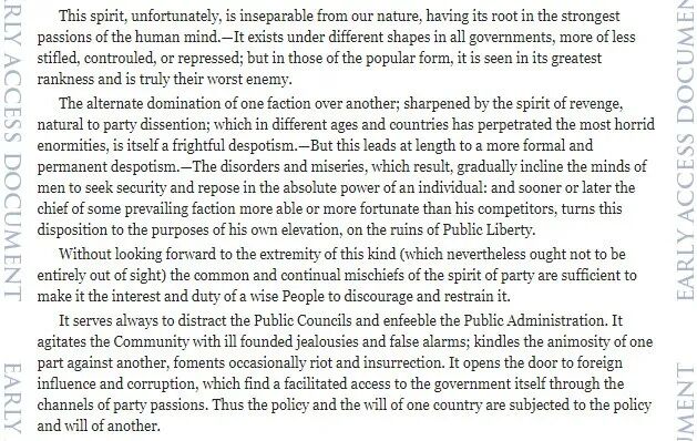 “不幸的是,党派主义思想与我们的本性不可分割,而且在人类脑海里最强烈的欲望之中扎根。它以各种不同的形式存在于所有政府中,虽然会受到一定的抑制、控制或约束。但那些常见的党派形式,往往是最令人讨厌的,也是政府最真正危险的敌人。”