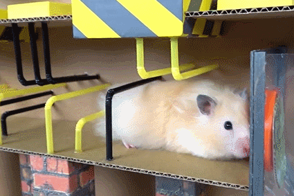 不过,当你仔细观察就能发现,这其实都是用纸板和塑料制作的小机关,小仓鼠在闯关的过程中并不会受到伤害。