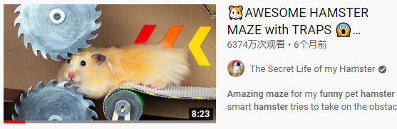 今天,我们则选择了一个视频分享给大家。这期视频来自油管 The Secret Life of my Hamster 频道,这是一个专门做各式各样的仓鼠视频的频道,下面这个有关小仓鼠走迷宫的有趣视频,在仅6个月的时间内,播放量就超过了6千万次。