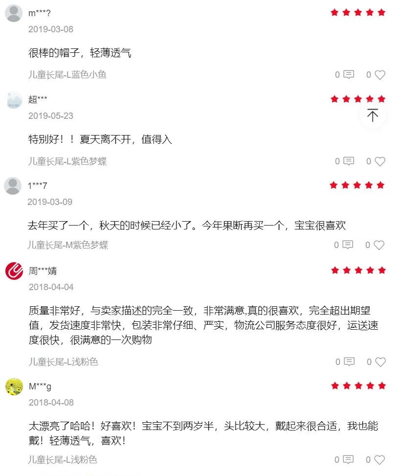 后来的几年,我们每年都会给大家推荐一些新款的成人和儿童的防晒帽,我们收到的产品评价,基本都说佩戴感受都很好。