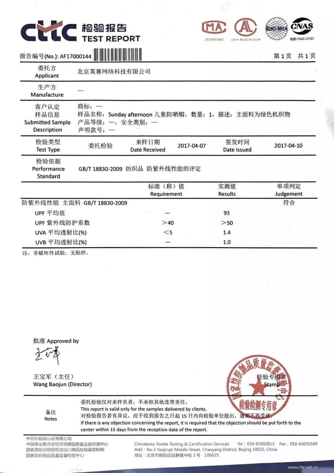 很多我们的读者对 Sunday Afternoons很熟悉,他们专注于户外产品的研发生产,防晒帽绝大多数都有UPF50+ 的防紫外线系数(最高防晒值)。这是我们第一次开团前,随机送检样品的检验报告。