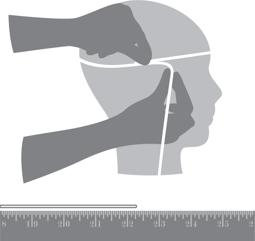 我们把左右的产品尺寸整理成表格,供大家参考,特别注意的是,测量头围时一定要用如下图这样正确的方法。用一条绳子,沿着耳朵、眉骨围绕头部绕一周,再测量绳子长度。