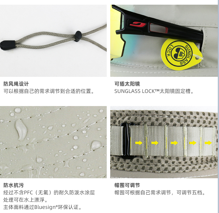 除以上几点外,能够打动我们的防晒帽,针对户外等场景的使用,还应该具备一定的其他应用功能设计。