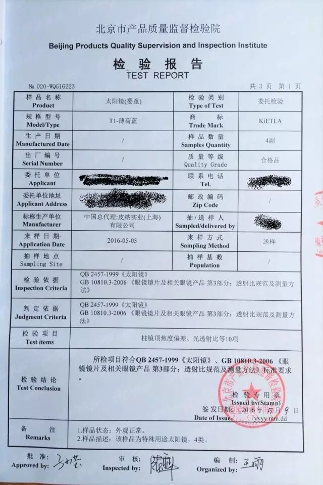 关于产品质量,虽然品牌提供了检测报告,但对于太阳镜这样的婴幼儿防护性产品,怎么小心都不为过,因此我们2016年在开团前,将Ki ET LA的产品送去北京市产品质量监督检验院,进行全方位十余项的检验,检验结果均合格。后来我们又将T5阶段的产品再次送检,报告显示均为合格。(检验报告见文末)