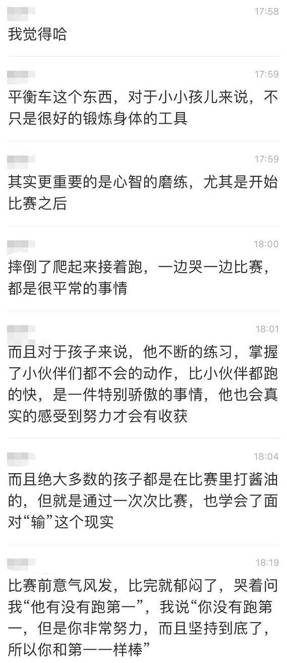 而满3岁之后,小朋友则开始参加了PUKY主办的平衡车大赛。在和他的妈妈聊这个事情的时候,收到了一段很值得分享给大家的话: