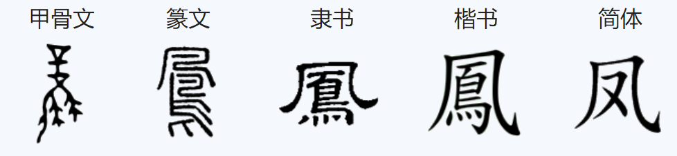 而“风”字呢?在甲骨文中,“风”的几种写法,或者和“凤”完全一样,或者小有差异,基本上也是一只鸟的形状。一些甲骨文专家认为,这是因为古人认为之所以会起风,是因为天上的神鸟凤凰扇动了翅膀。因此就用凤字,或者稍微改动之后,来表示空气的流动。