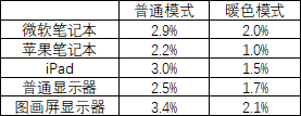 目前的电脑和平板基本都有普通模式和暖色(护眼、夜间)模式可选。相比普通模式,暖色模式下蓝光比例更低,因此我们测试了两种不同模式下的蓝光比(如果是可调节的暖色模式,选择中间强度)。