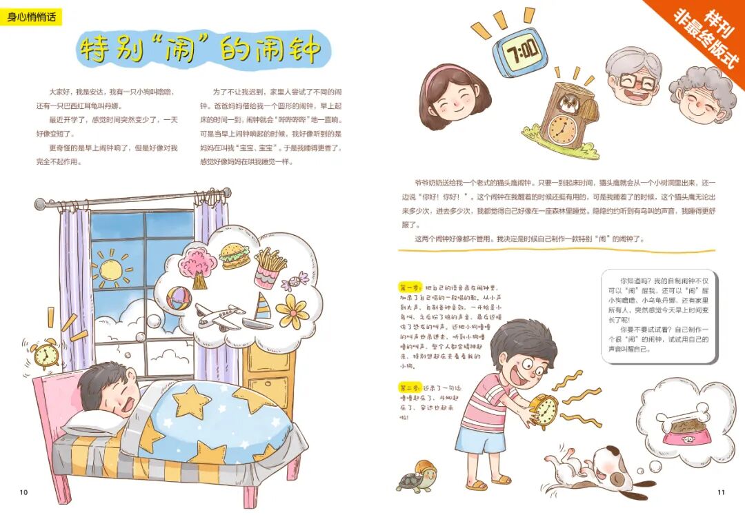 用绘本的方式教会孩子怎样定一个专门属于自己的闹钟,让孩子体验到能被自己的声音叫醒的期待感。让孩子期待起床是最好的引导孩子早起、培养孩子良好的早起习惯的方式了。