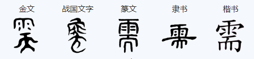 “需”字从金文的年代开始,字形就和现在很像:最早的“需”是上方是一个“雨”,下方是一个正面人站立的“天”字。在战国的时候,“天”被写成了“而”,从而一直变成现在的样子。