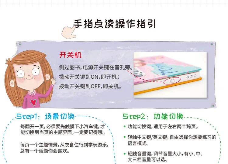 翻开书页,尽量铺平页面,每一页都要先点击小汽车图案,然后按书页上的小喇叭,即可收听纯正的英语语句发音,轻点书页上方EN/CH 也可自由切换中英文发声模式。
