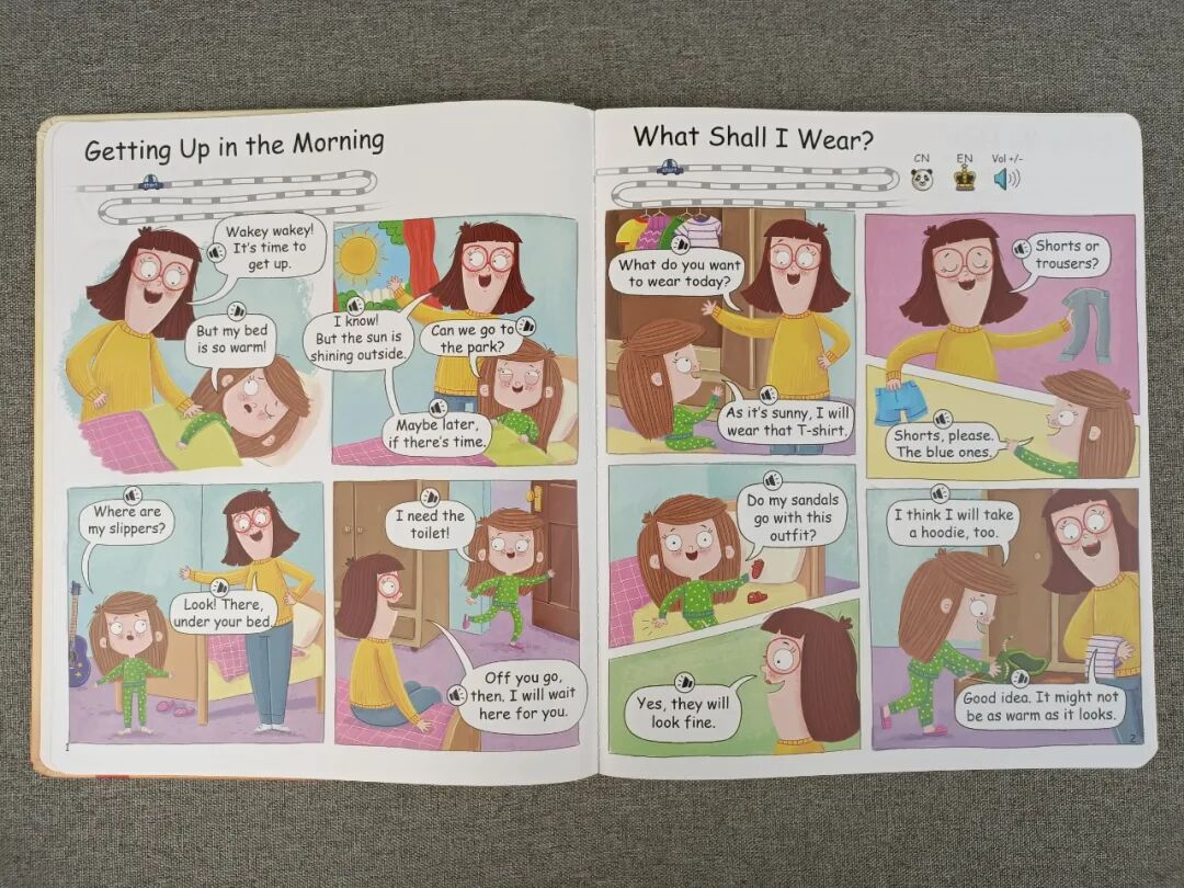 这套书不同于传统的字母—音标—单词—句式—语法—一句一句背句子的教学方法,而是设定了一个故事性的生活场景,以日常对话形式来教学,用孩子们都喜欢的漫画的版面设计,只需要手指点击,就可以完成学习。