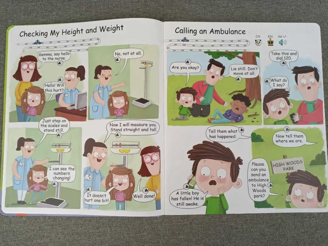 这本的第1、2个场景是量身高体重,以及帮小男孩叫救护车的故事。了解了这两个场景,可以和孩子用英语进行一场角色扮演,在家扮演“量身高体重”的游戏,和“叫救护车”的游戏,在游戏中练习英语口语。