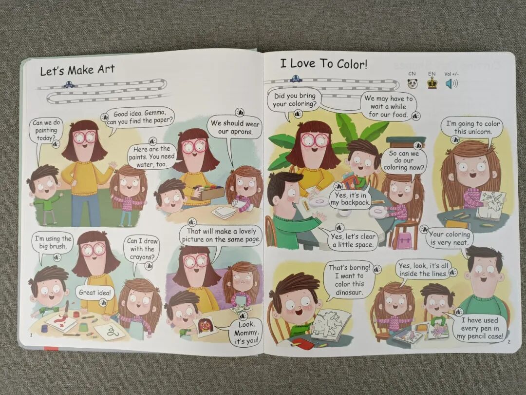 这两个场景是小雀斑一家在家里玩艺术和在餐厅给画涂颜色的故事。学完了这两个场景,孩子就能在画画的时候用简单的英语进行对话了。