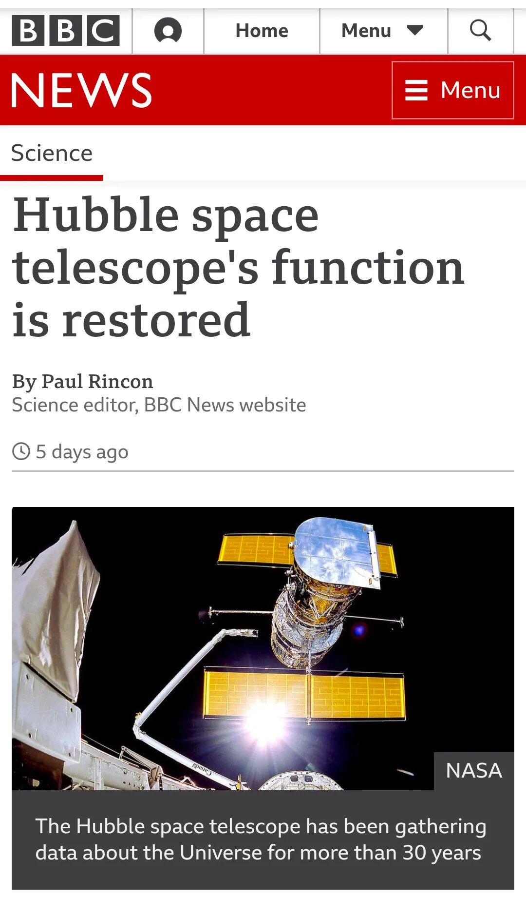 7月19日,因故障停止工作的哈勃太空望远镜经历了一个多月的维修,终于完成了修复,重新投入使用。