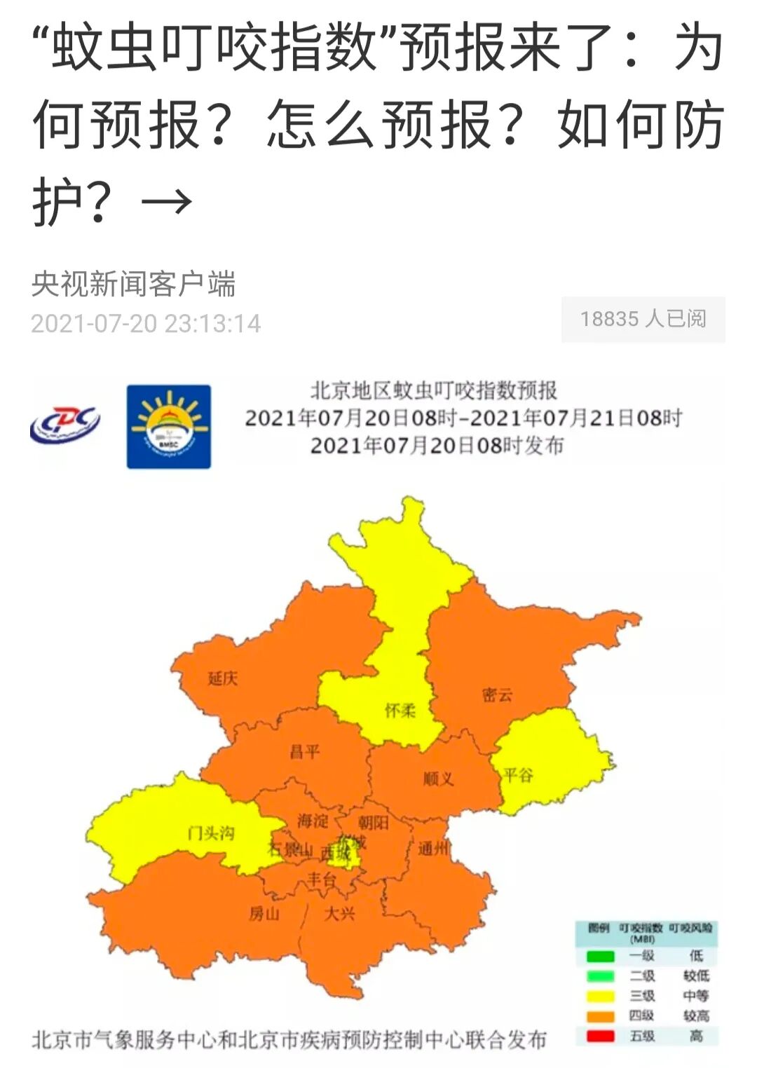 7月20日的北京市各区蚊虫叮咬指数预报 图片来源:央视新闻客户端